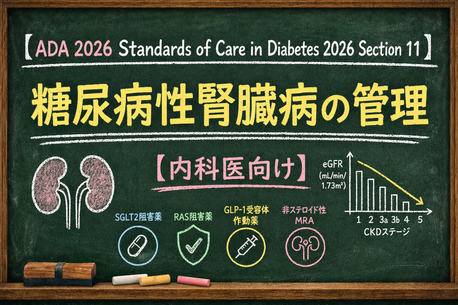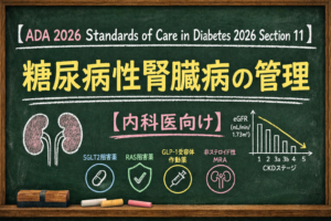 今回は、ADAの糖尿病性腎臓病のReview (Standards of Care in Diabetes 2026のSection 11(Chronic Kidney Disease and Risk Management))をもとに、糖尿病合併CKDの管理を整理してみます。