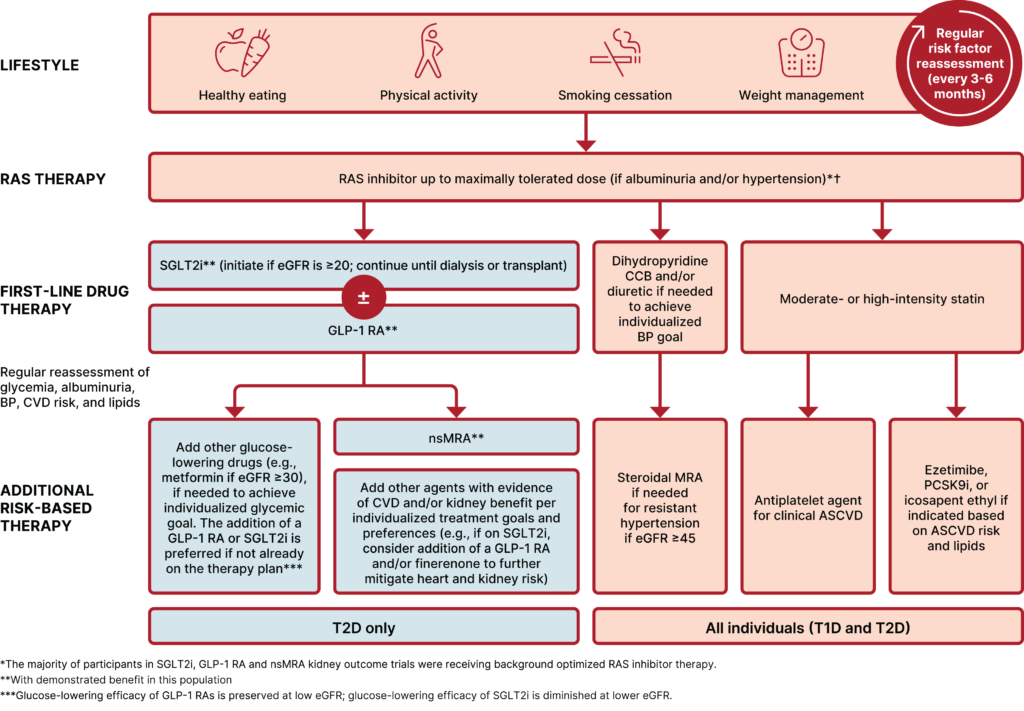 ライフスタイル介入 → RAS阻害薬(最大忍容量)→ SGLT2阻害薬 ± GLP-1 RA → フィネレノン追加