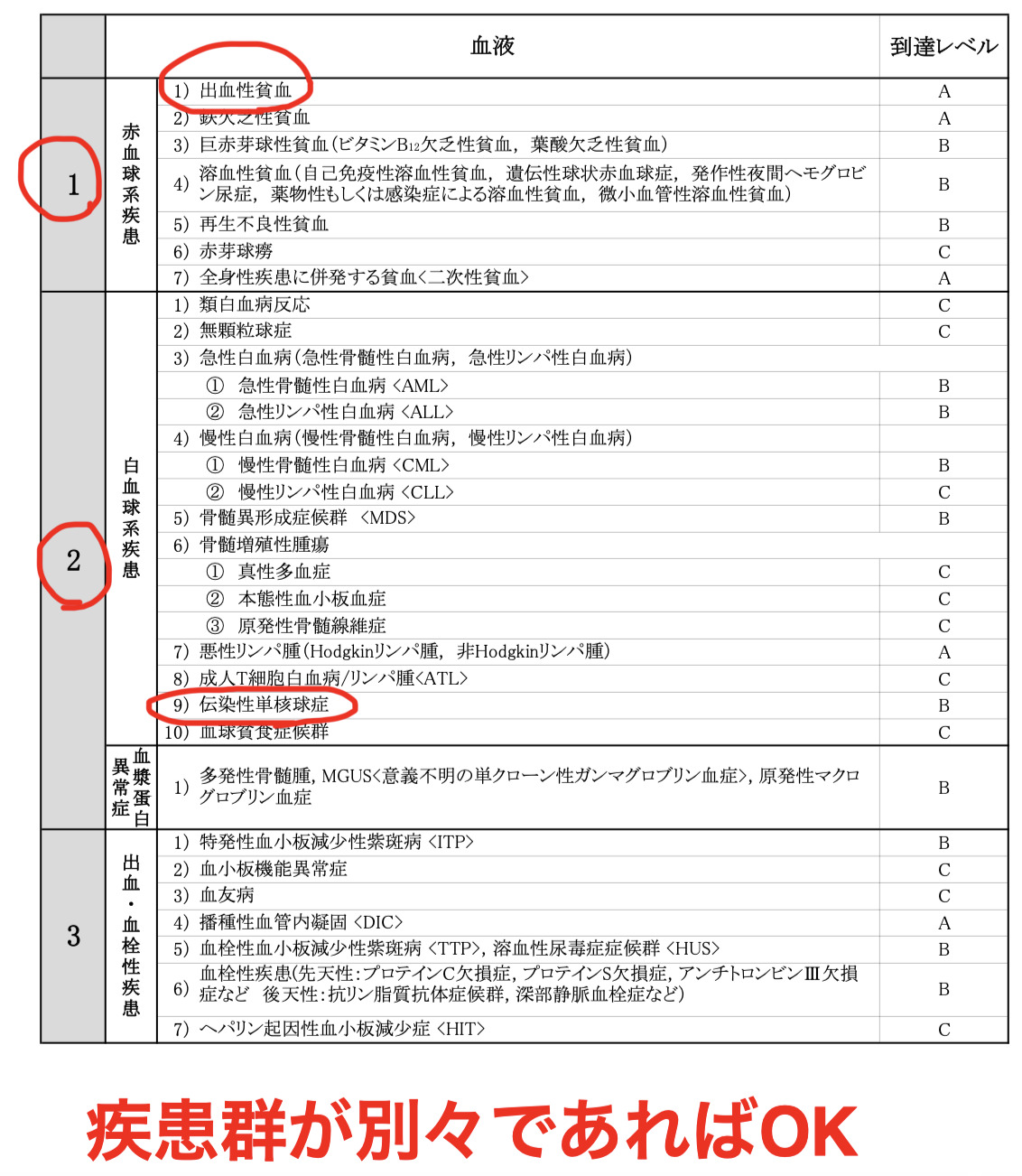 血液の分野であれば、「1の出血性貧血と、2の伝染性単核球症」といった感じです。