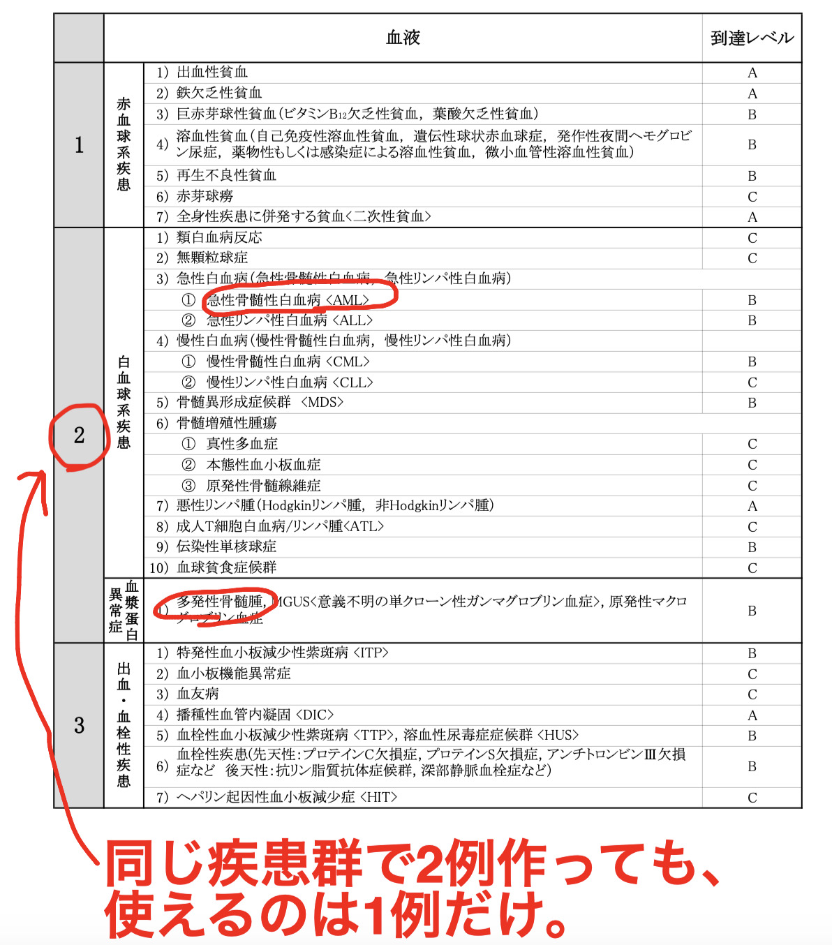 ①白血病の症例と②多発性骨髄腫の症例を経験したとして、その2例を病歴要約に使おうと考えても、疾患群が同じであるため使えません。